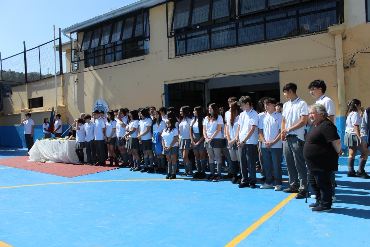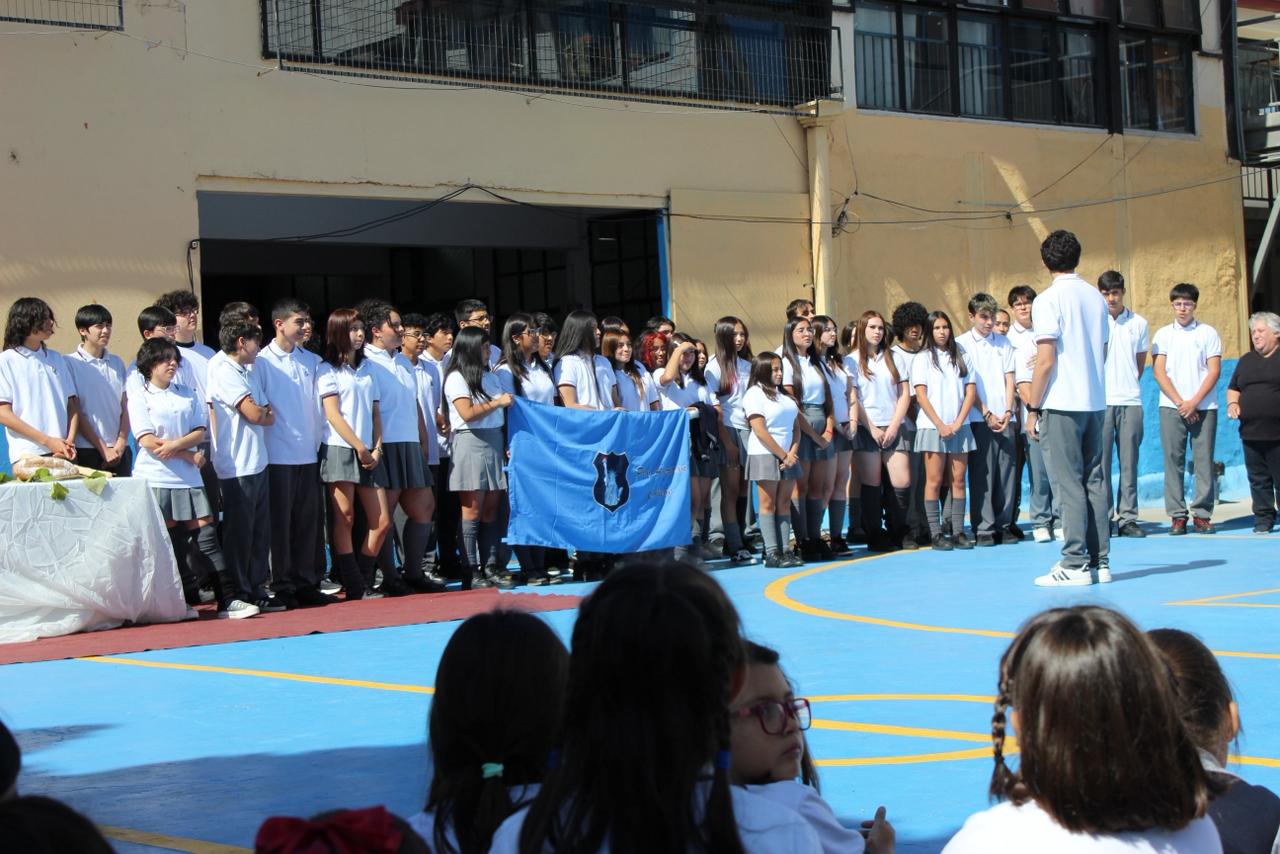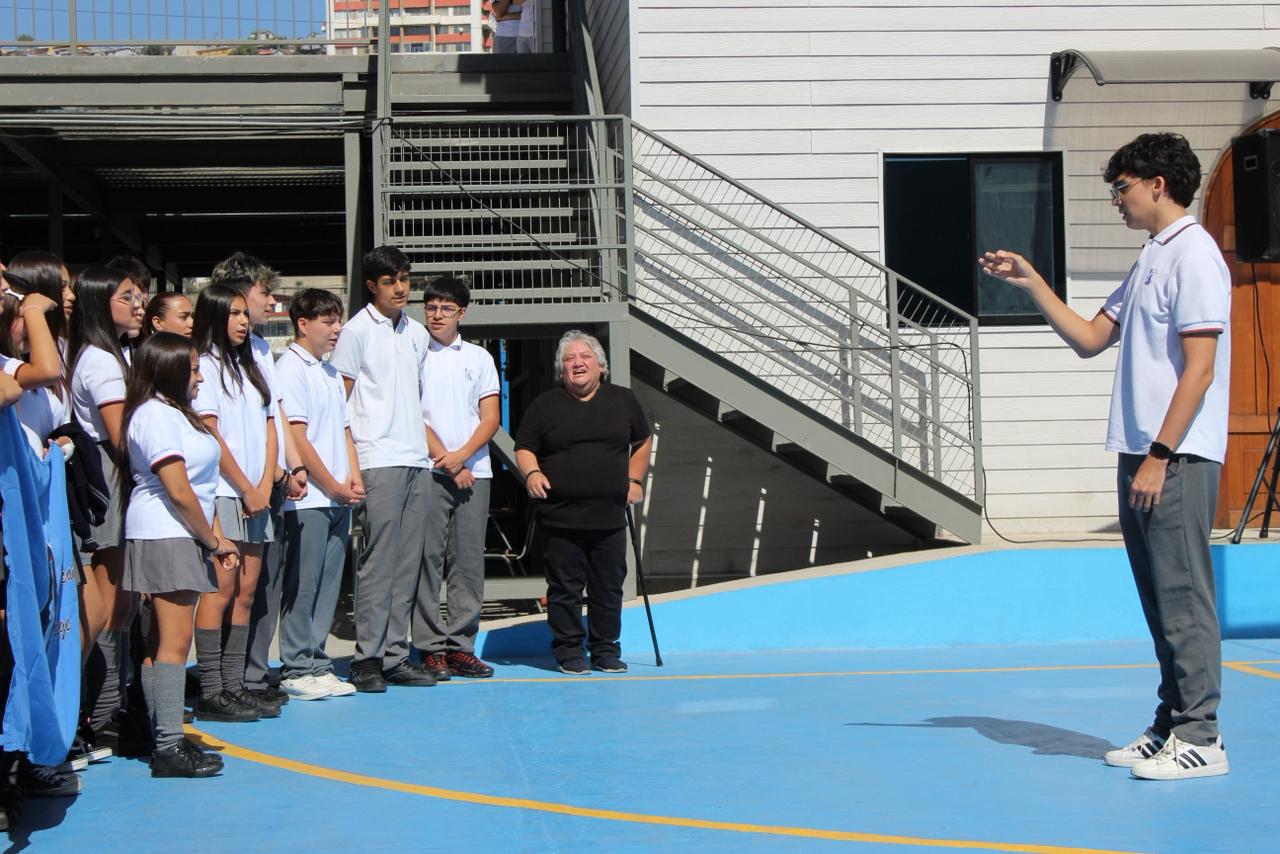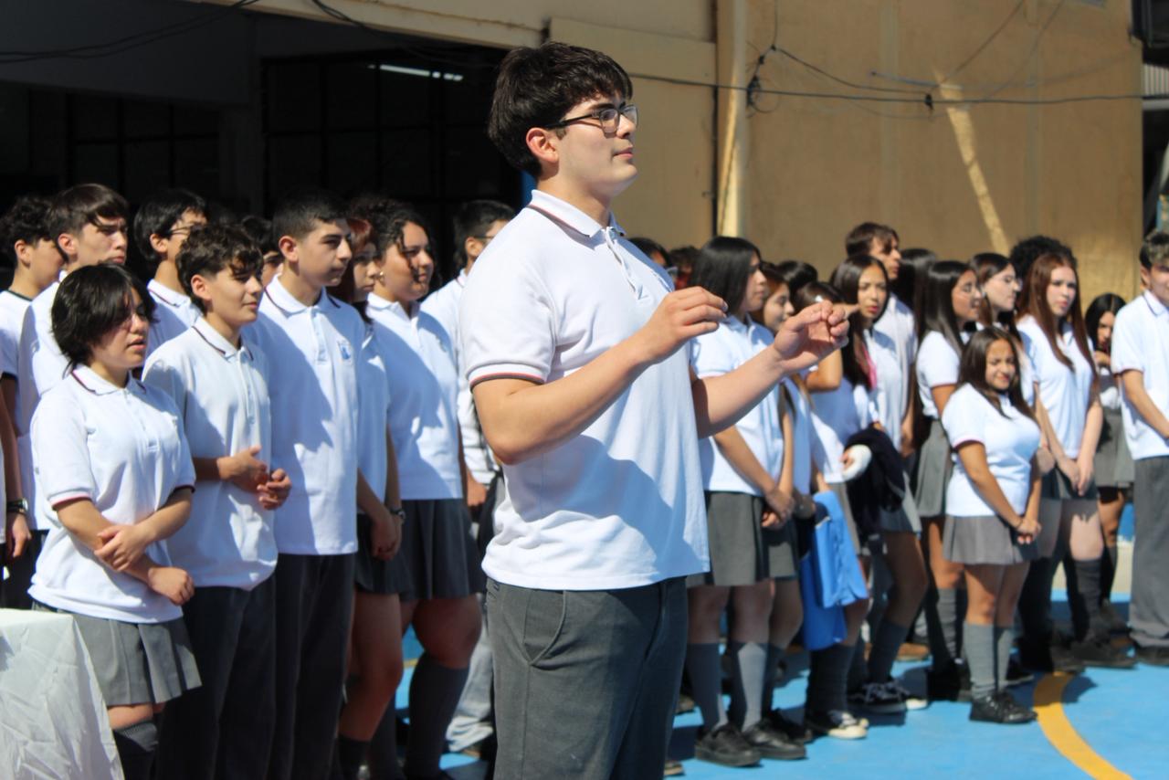 La jornada comenzó con el izamiento del pabellón patrio, instancia en la que un estudiante destacó al dirigir mediante técnica de dirección coral, marcando el compás con precisión y compromiso.